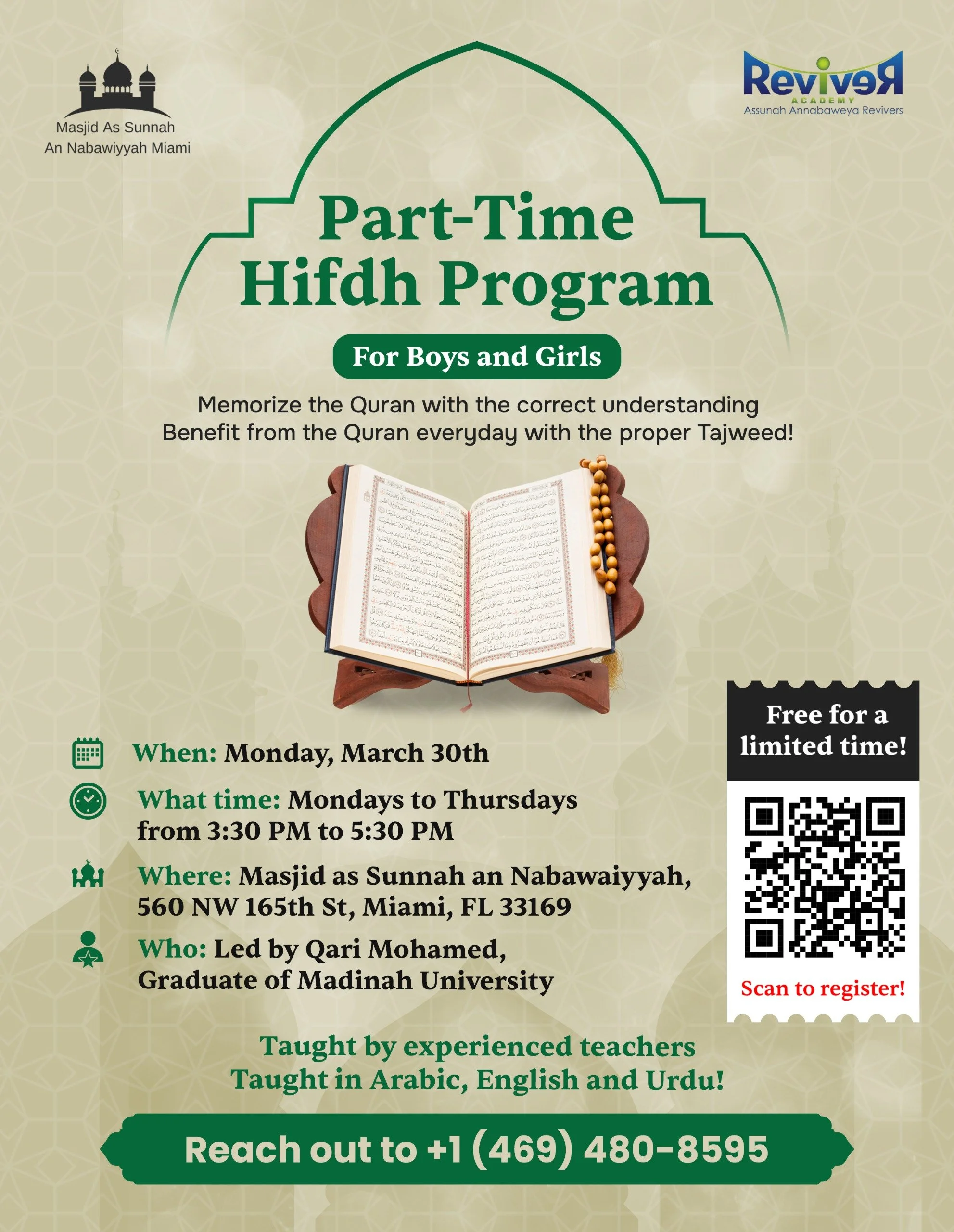 Classes are held Monday through Thursday from 3:30 PM to 5:30 PM, allowing students to pursue Hifdh alongside their regular schooling.